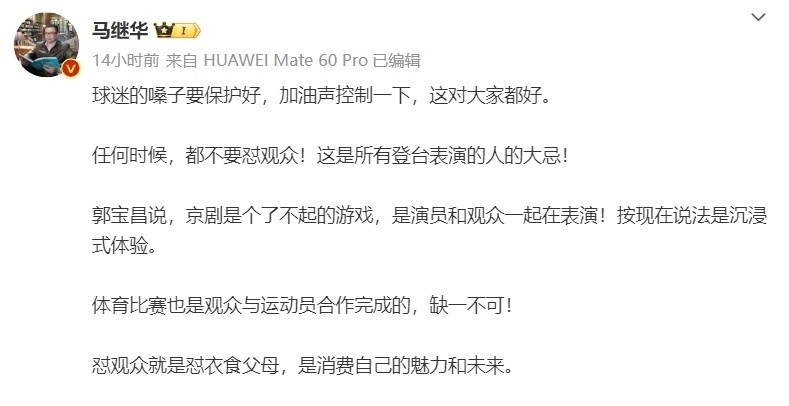 但随之而来的,当然是巨大的争议,支持该行为的球迷认为,王曼昱这是对不尊重她的球迷喊出自己的心声,而反对的球迷则认为,观众花钱看球,支持谁喊谁的名字,是大家的自由,而这里面反对王曼昱行为的人,还包括大V马继华,他就在社交平台上写道:任何时候都不要怼观众!这是所有登台表演的人的大忌!因为怼观众,就是怼你的衣食父母!